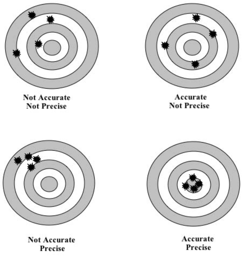 Accuracy, 指在一定实验条件下多次测试的平均值和真实值相符合的程度, 以误差表示